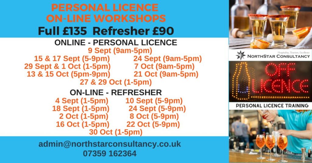 Personal Licence training £165 per person (inc venue, refreshments, workbook, worksheets and exam fees)