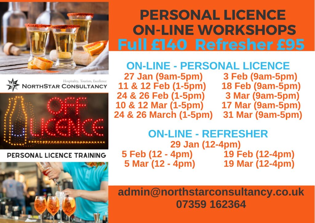 On-line Personal Licence training £140 (on-line, including workbook, worksheets and exam fees)